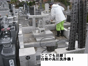 旧墓石・外柵をジェット噴射で苔・水垢を洗浄します。